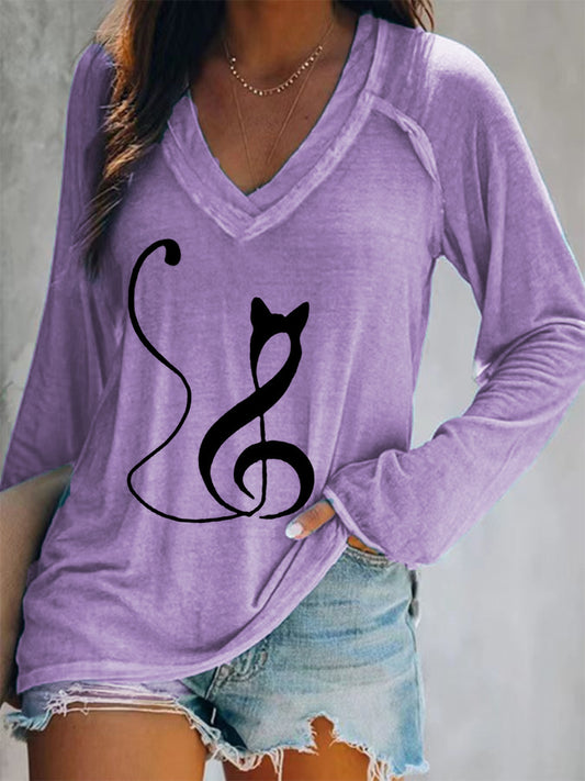 • Women's Music Note Inspired Cat Print V-Neck T-Shirt