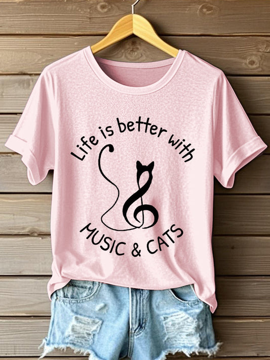 • Women's Life Is Better With Music & Cats Print T-Shirt