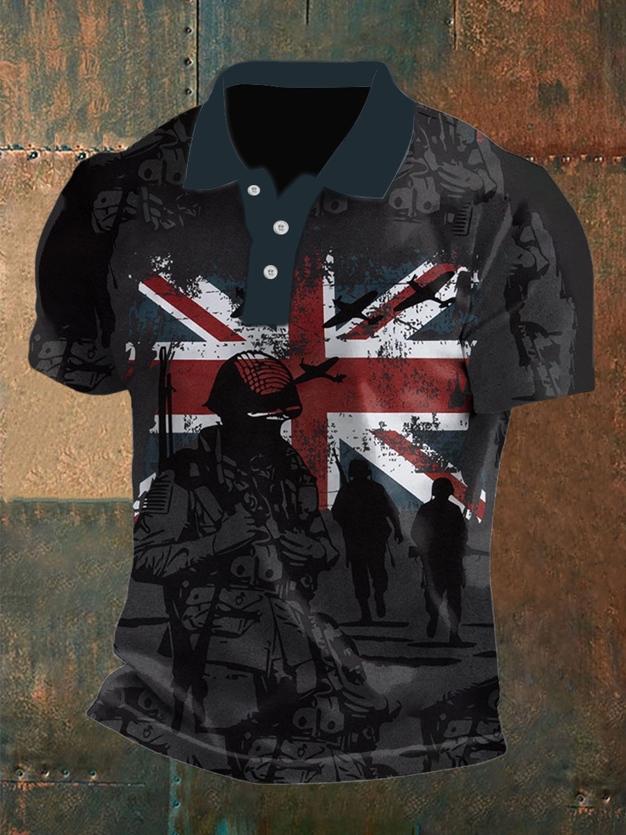 Men's Vintage British Flag Veteran War Aircraft Abstract Printed Casual Cotton Short Sleeve Polo Shirt