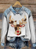 Women's Christmas Reindeer Printed Denim Patchwork Lapel Long Sleeved Sweatshirt