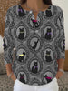 Women's Elegant Black Cat Frame Print Henley Sweater