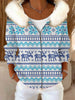 Women's Fresh Blue Snowflake & Reindeer Print Fur Collar Jacket
