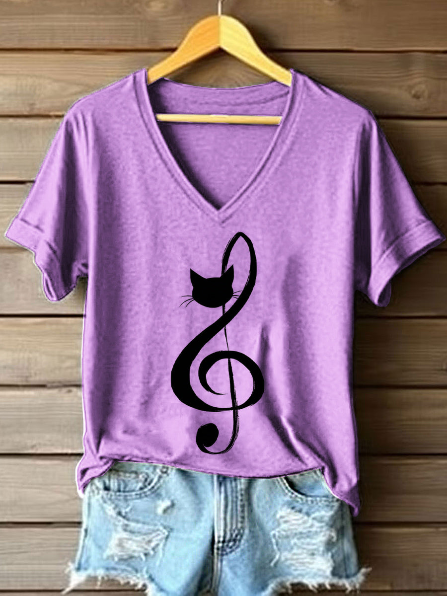 Women's Music Note Inspired Cat Print V-Neck T-Shirt