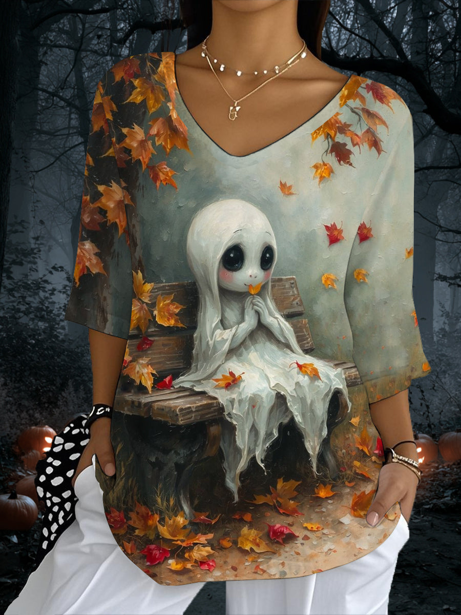 Women's Vintage Halloween Cute Ghost Printed V-Neck Half-Sleeve T-Shirt